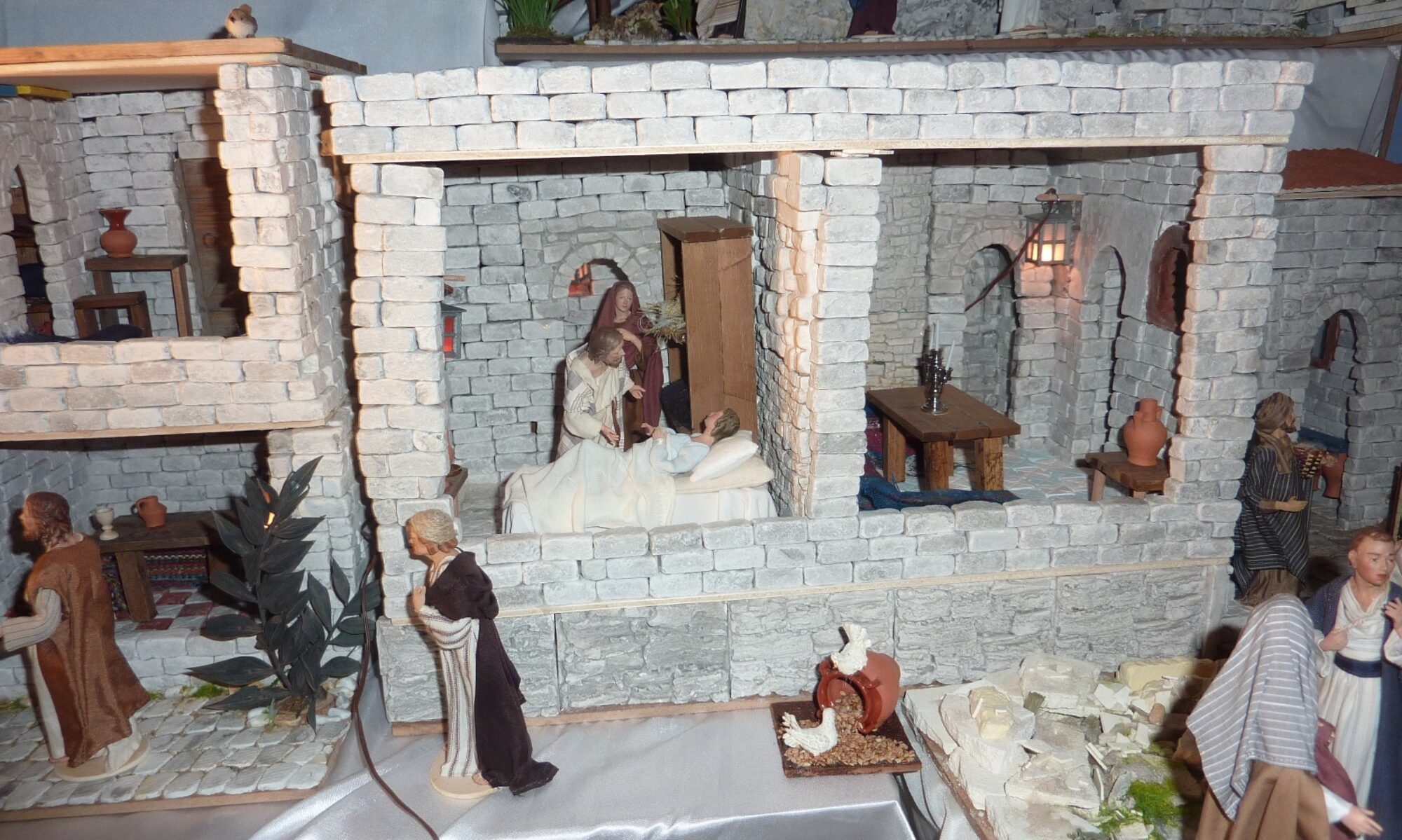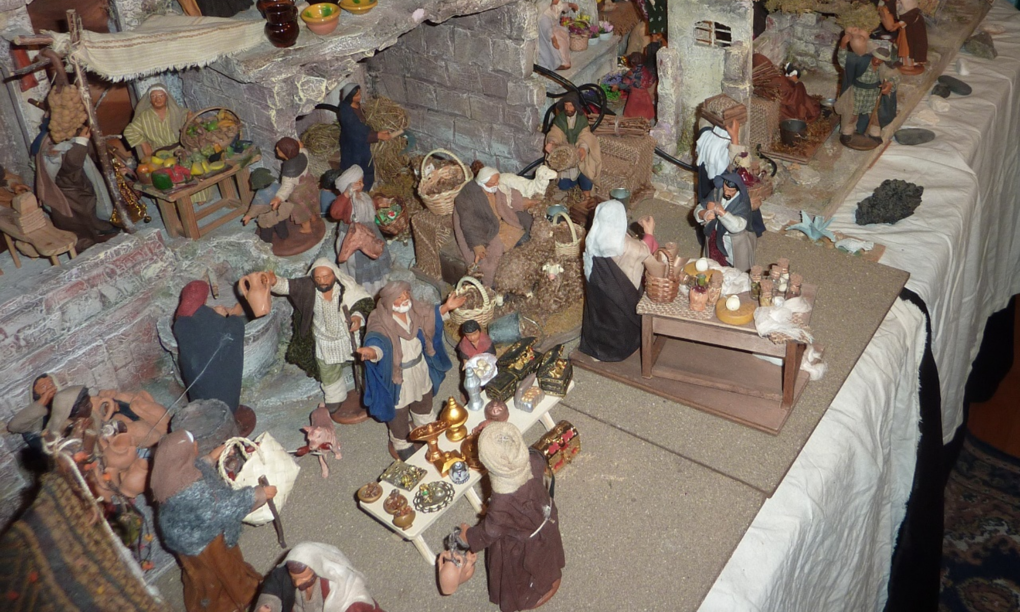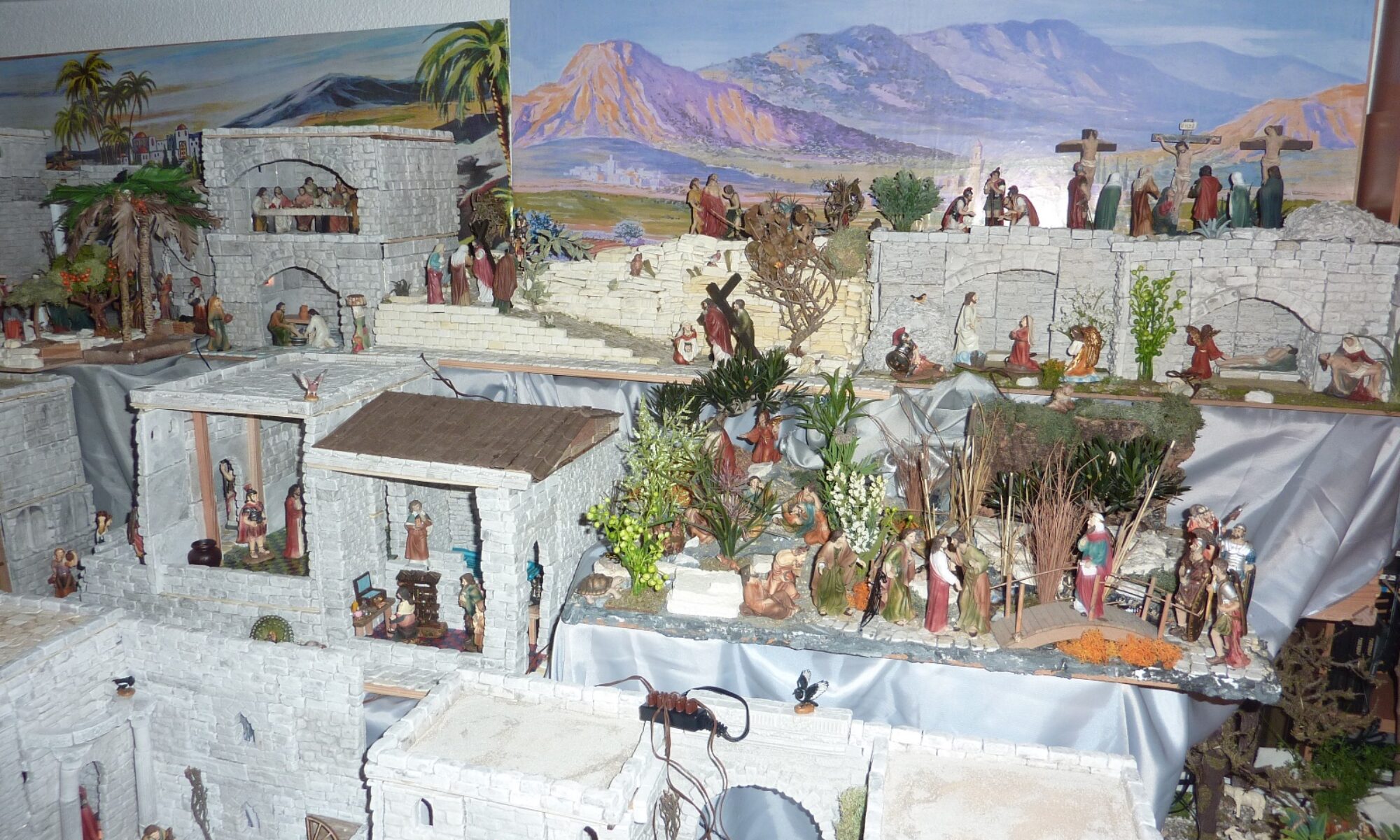 Die Ausstellung umfasst die Weihnachtsgeschichten nach Lukas und Matthäus, zahlreiche Begebenheiten aus seinem Leben (z.B. Hochzeit zu Kana, Taufe, Zachäus, die Auferweckung der Tochter des Jairus, Maria und Marta, Lazarus, diverse Heilungen, das Gleichnis vom barmherzigen Samariter) sowie Szenen aus der Passion wie den Einzug in Jerusalem, das letzte Abendmahl, die Nacht am Ölberg, Kreuzigung und Auferstehung. Insgesamt sind es 60 – 70 biblische oder von der Bibel abgeleitete Szenen. Gezeigt werden inklusive Tiere weit über 1500 Figuren aus Italien, Spanien und Deutschland, darunter neapolitanische Tonfiguren in unterschiedlichen Grössen sowie geschnitzte und bekleidete Figuren aus dem Grödner Tal. Nebst den biblischen Figuren rund um Jesu Leben bevölkern Händler, Handwerker und Landwirte die zahlreichen Gebäude, Städte und Landschaften.